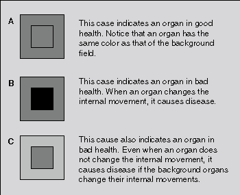 Importantly, these phenomena enable us to indicate that an organ takes three kinds of conditions. As shown in the figures below, when a small field shows the same darkness of color as that of the background field, it can theoretically indicate an organ in good health. When a small field changes the color and differs in color from the background field, it can theoretically indicate an organ in bad health. Also when the background field of the small field changes the darkness of the color, the small field can theoretically indicate an organ in bad health. In short, these results suggest that the fundamental causes of disease can be classified into two kinds.