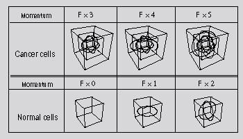 Now, let us make theoretical models of two kinds of cells: a normal and a cancer cell. In the previous two sections, we can obtain two different points between a normal and a cancer cell. First, although a normal cell does not have three-dimensional movement, a cancer cell has it. Second, a cancer cell contains a large amount of momentum compared with a normal cell. These two indications enable us to make theoretical models of normal and cancer cells as shown in the figure below.