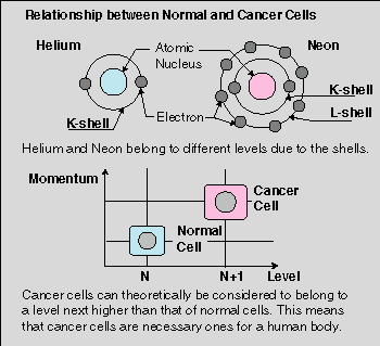 A normal and a cancer cell differ in level; specifically, a cancer cell can be considered to belong to a level next higher than that of a normal cell. This phenomenon can be deduced from different kinds of atoms. Atoms can be classified into different groups according to their shells. For example, helium has a shell (K-shell); neon has two shells (K and L-shell). Thus, we can say that neon belongs to a level next higher than that of helium. Likewise, a normal and a cancer cell, as shown in the figures above, can be considered to have a shell and two shells respectively, so that it can be concluded that a cancer cell belongs to a level next higher than that of a normal cell. That is, a cell and an atom resemble each other in system. |