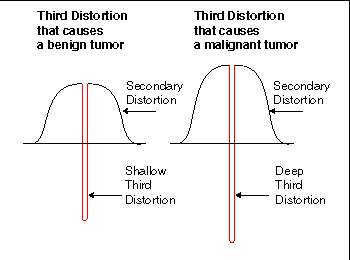 If so, how does third distortion divide a tumor between a benign and a malignant one? It is the depth of third distortion. Shallow third distortion carries the containing cells to a level within a normal cell level, so that it transform them into benign tumor cells. On the other hand, deep third distortion carries the containing cells to a level over a normal cell level, so that it transforms them into malignant tumor cells. |