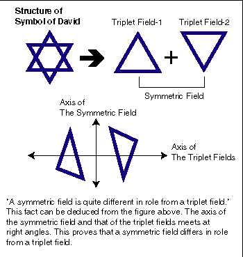 Importantly, in this structure, the axis of the two triplet fields and that of the symmetric field meet at right angles. As shown in the figure below, in the symbol of david, the two triplet fields have the same axis; on the other hand, the symmetric field has an another axis. These two axes meet at right angles, and does not interfere with the other. Thus, it is suggested that in nature, a triplet field and a symmetric field play different roles with each other. For the reasons, we can indicate the following two points. First, a triplet and a symmetric field have different types of stability. Second, when these two field sets combine together, they produce strong stability. |
