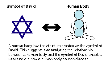 A human body also has the structure created just like the symbol of David, so that it not only has very-strong stability but also causes disease on the basis of this structure. Chinese medicine has a concept of "Three-Yin and Three-Yang," and explains how a human body causes disease. This concept: "Three-Yin and Three-Yang" basically has the same meaning as that of the symbol of David. This concept indicates not only that a human body is created just like the symbol of David, but also that a human body causes disease on the basis of this structure. Indeed, checking the relationship between a human body and "Symbol of David" will enable us to find out an important key about disease. |