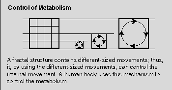 Besides measuring the size of a focal field, a human body must also have the ability to control the internal movement (metabolism) by using the fractalism. As explained on the preceding page, a human body is created as a fractal structure, which can be divided into different-sized units according to the levels. These different-sized units contain different-sized movements. By using these different-sized movements, a human body can control the internal movement (metabolic turnover rate). I will explain this detailed mechanism on the following section: "Fractal Kinetic Theory." |