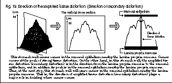 In the case of adenocarcinoma resulting from atrophic gastritis, the secondary distortion (= the amplified tissue distortion) is in the direction from the lamina propria mucosae to the mucosal epithelium. This stomach wall amplifies the tissue distortion by decreasing the momentum. In this process, the mucosal epithelium has decreased the metabolic activity, so that it strongly decreases the momentum. In contrast, the lamina propria mucosae, different from the mucosal epithelium, maintains good metabolic activity, so that it decreases the momentum in parallel to the momentum contained in the stomach wall. By these mechanisms, secondary distortion at adenocarcinoma enlarges in the direction from the lamina propria mucosae to the mucosal epithelium.