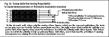Lastly, let us also analyze theoretically how the stomach causes leiomyosarcoma in the lamina muscularis mucosae. This process can be divided into three steps. At the first step, the stomach causes primary tissue distortion in between the lamina muscularis mucosae and the submucosa. This primary tissue distortion indicates initial distortion. At the next step, the stomach stepwise amplifies the initial distortion by decreasing the momentum, and causes secondary distortion. At the last step, in order to neutralize the secondary distortion, the stomach causes third distortion in the lamina muscularis mucosae. Just this third distortion has the ability to cause leiomyosarcoma in the lamina muscularis mucosae. In short, leiomyosarcoma occurs almost by the same mechanism as other two carcinogeneses already explained in the previous two sections.