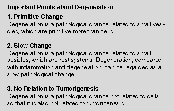 First, degeneration can be considered a primitive pathological change compared with inflammation and tumorigenesis. Degeneration is a pathological change related to static systems: small vesicles. In addition, static systems: small vesicles are generally more primitive than dynamic systems: cells. Thus, it can be concluded that degeneration is a primitive pathological change compared with inflammation and tumorigenesis.