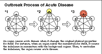 An organ causes acute disease to repair the imbalance between the organ and the background organs. When an organ, for instance, changes the momentum, it causes the imbalance in momentum with the background organs. Then, to neutralize this imbalance in momentum, the organ causes disease. That is, acute disease, which is caused in an organ, is related mainly to the organ itself, but slightly to the background organs. This is just the special characteristic of acute disease. |