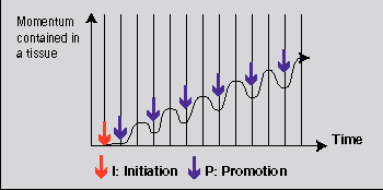 (In the process of Two-Stage Carcinogenesis, every time a tissue already treated with an initiator is also treated with a promoter, it raises the momentum. Why? This is because a promoter indicates a chemical substance having the ability of causing inflammation. This reveals that a tissue needs inflammation to cause tumorigenesis.) |